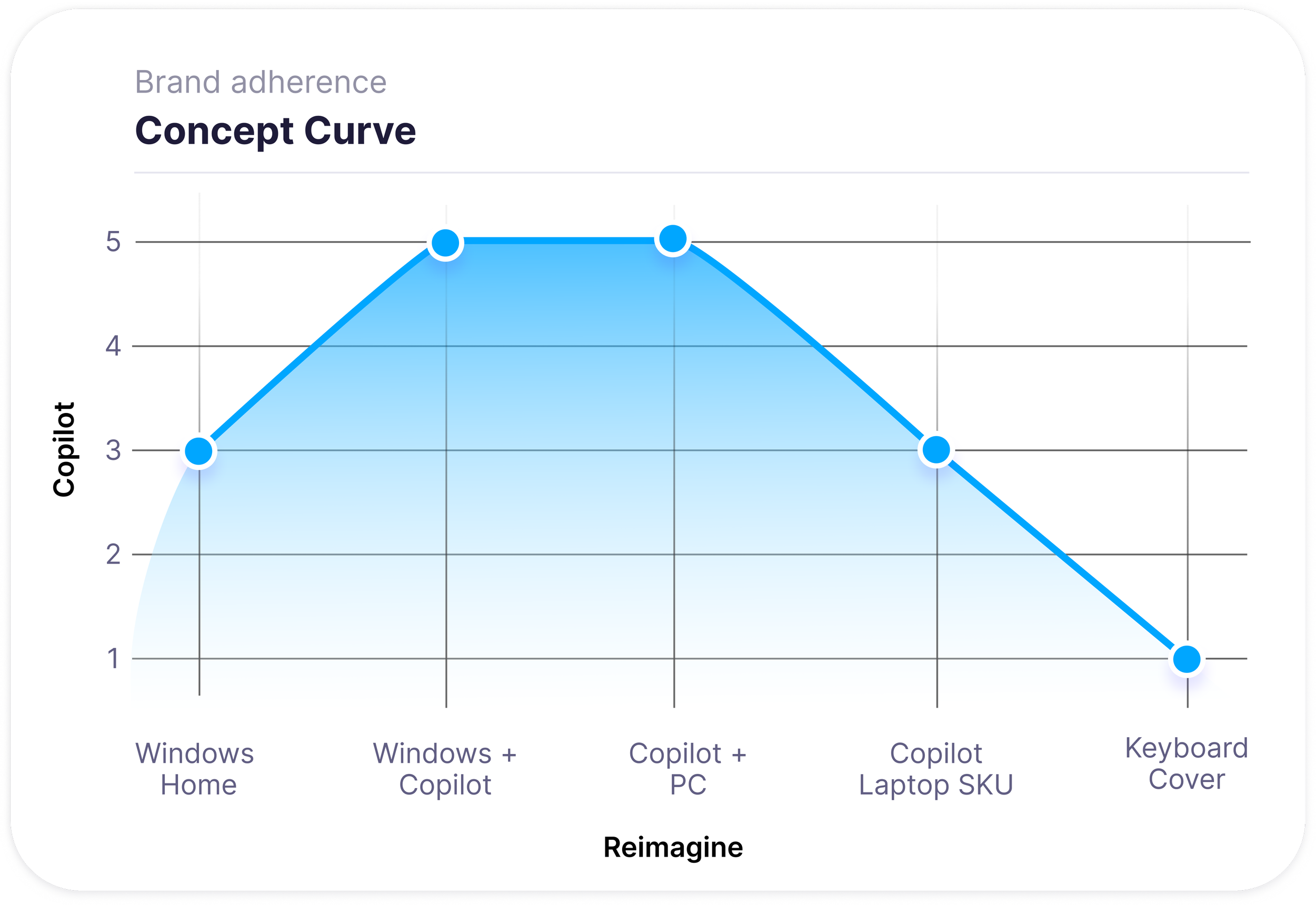 When analyzing the branding and UI journey of a user navigating Microsoft Copilot content within the Windows ecosystem, the concept curve begins midway up the graph. Unlike third-party retailers, Windows already shares a strong visual and functional alignment with Copilot, meaning that the starting point leans naturally toward Copilot’s branding. From the outset, elements such as Windows’ modern UI, soft gradients, and minimalistic design language create a seamless foundation where Copilot’s presence feels native rather than intrusive.