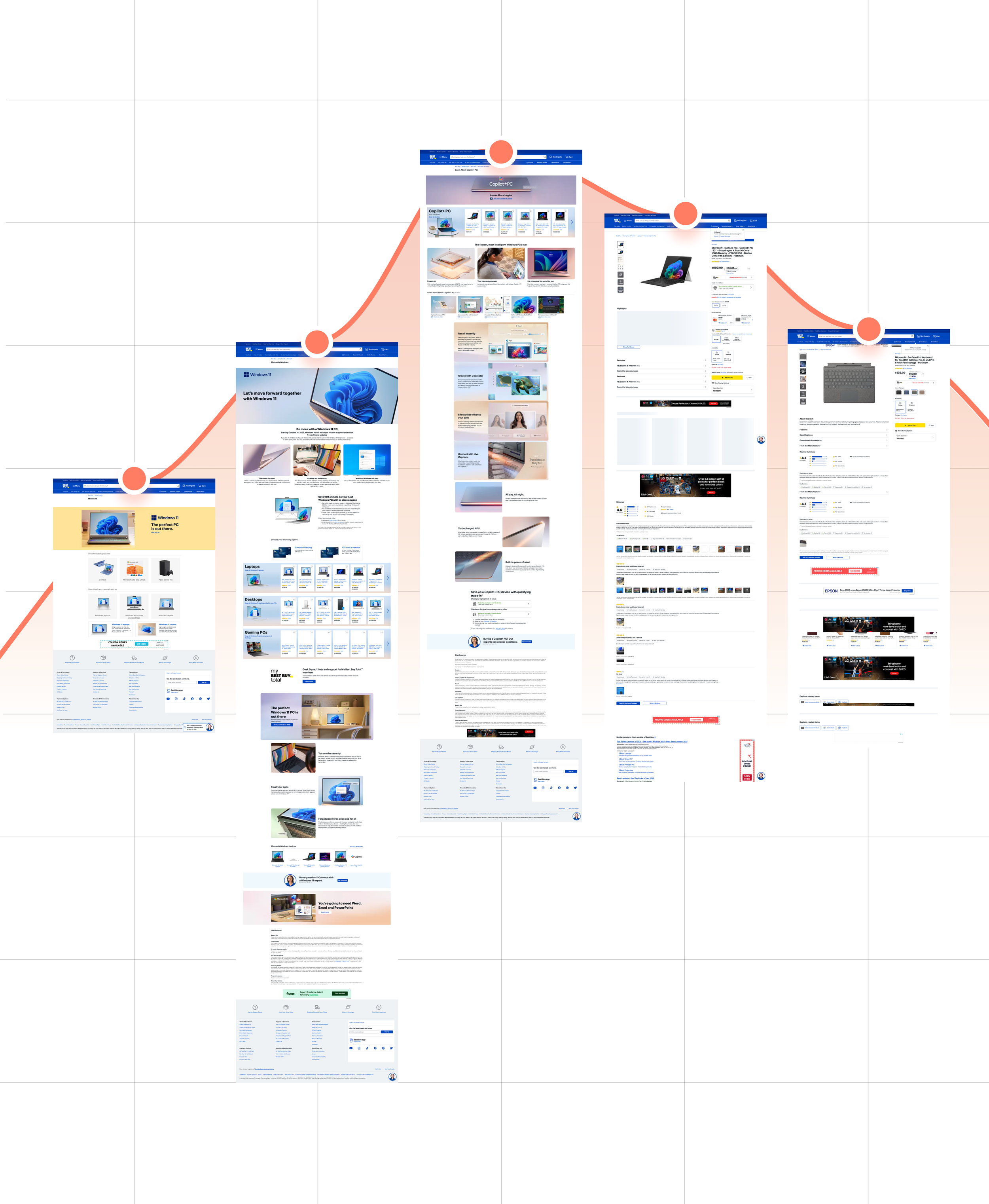 From this peak, the curve begins a gradual decline as users transition into product-specific pages and purchasing options. Amazon’s branding subtly re-emerges, ensuring a smooth shift back into the familiar retail environment while still maintaining Copilot’s presence in a more integrated way. Notably, as users move from the device product page to the accessories page, the branding remains consistent, creating a flatline on the graph. This suggests that while the marketing-heavy elements of Copilot branding are scaled back, its UI and visual identity remain present across related product pages, reinforcing continuity within the shopping experience.